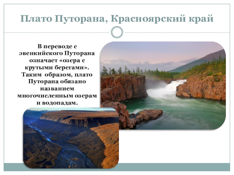 крутыми берегами». Таким образом, плато Путорана обязано названием многочисленным озерам и водопадам.
