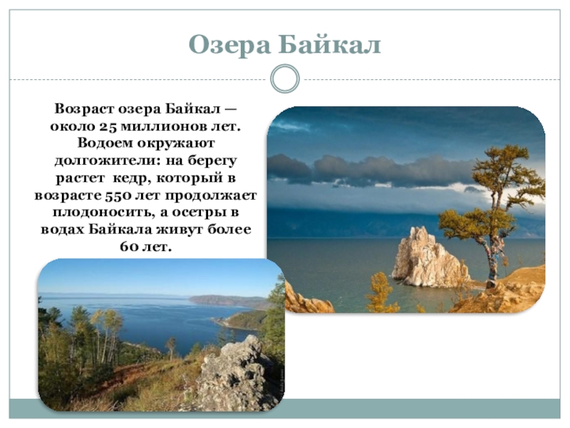 Возраст озера Байкал — около 25 миллионов лет. Водоем окружают