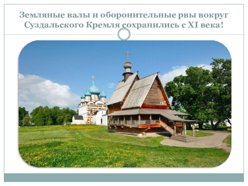 Слайд 13Земляные валы и оборонительные рвы вокруг Суздальского Кремля сохранились с XI