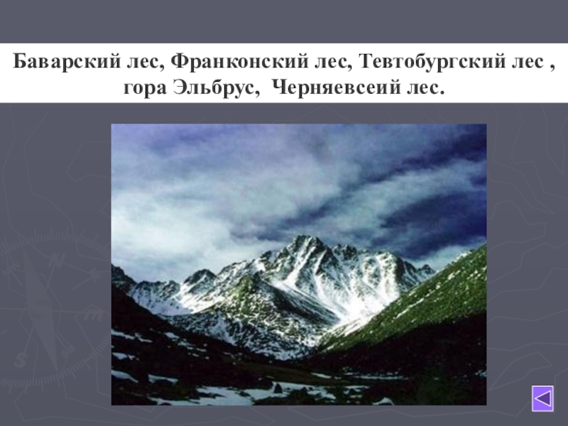 Баварский лес, Франконский лес, Тевтобургский лес , гора Эльбрус, Черняевсеий лес.