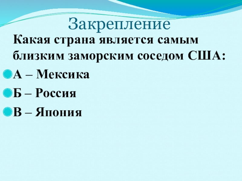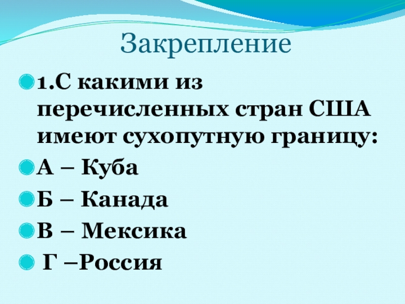 1.С какими из перечисленных стран США имеют сухопутную границу: