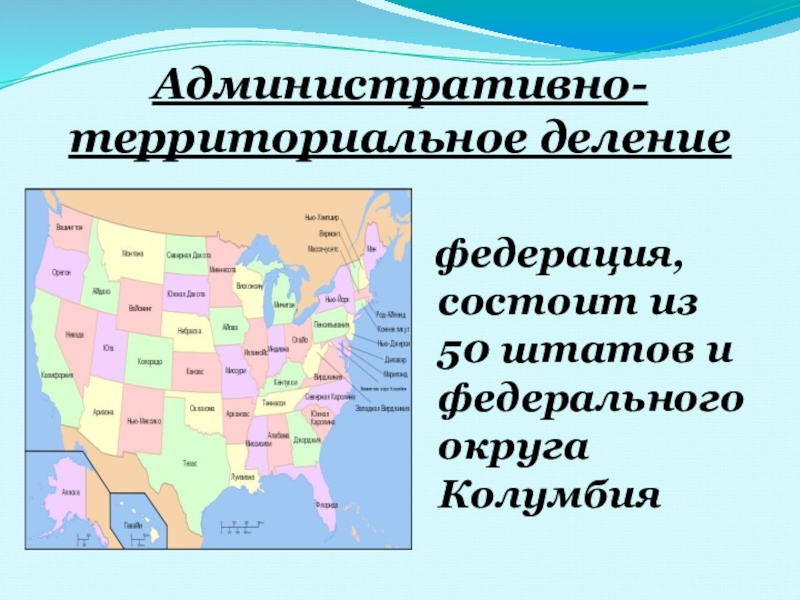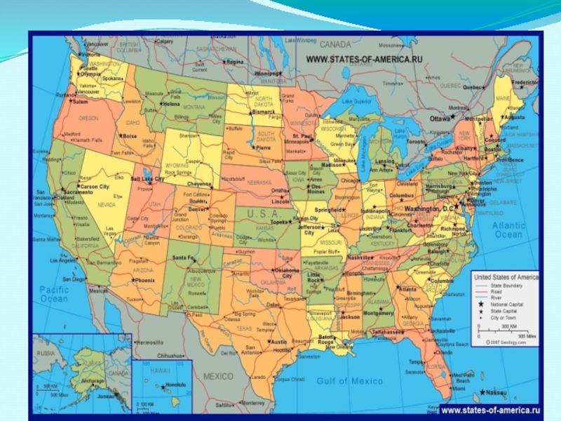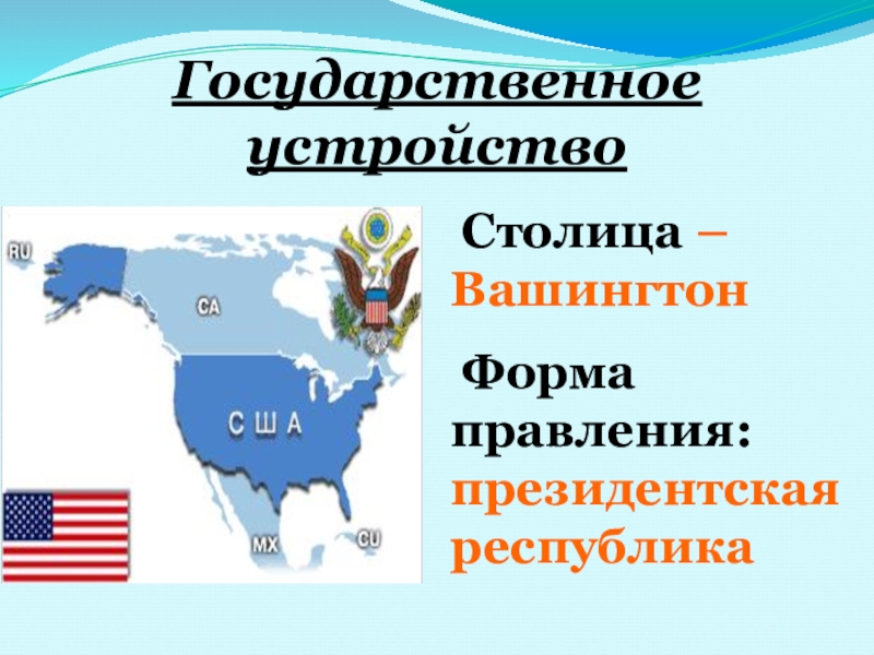 Штаты Америки, страна «Большой семёрки», 9,8 млн. км 2, Вашингтон, президентская республика, федеративное государство, 32 чел./км2