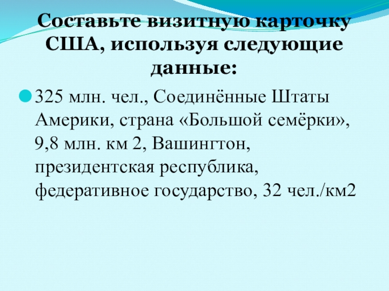 Слайд 6Составьте визитную карточку США, используя следующие данные: