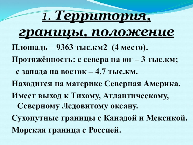 страны. Выход к океанам способствует транспортно-экономическим связям с государствами мира в обоих полушариях. Границы с соседними странами – спокойные. Природные рубежи не препятствуют связи с ними.