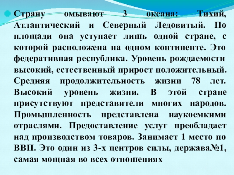 она уступает лишь одной стране, с которой расположена на одном континенте. Это федеративная республика. Уровень рождаемости высокий, естественный прирост положительный. Средняя продолжительность жизни 78 лет. Высокий уровень жизни. В этой стране присутствуют представители многих народов. Промышленность представлена наукоемкими отраслями. Предоставление услуг преобладает над производством товаров. Занимает 1 место по ВВП. Это один из 3-х центров силы, держава№1, самая мощная во всех отношениях