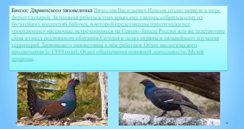 Слайд 7Биолог Дарвинского заповедника Вячеслав Васильевич Немцев создал первую в мире ферму