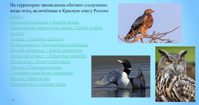 На территории заповедника обитают следующие виды птиц, включённые в Красную книгу