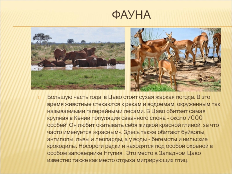 ФАУНАБольшую часть года  в Цаво стоит сухая жаркая погода. В это время животные стекаются к рекам и водоемам,