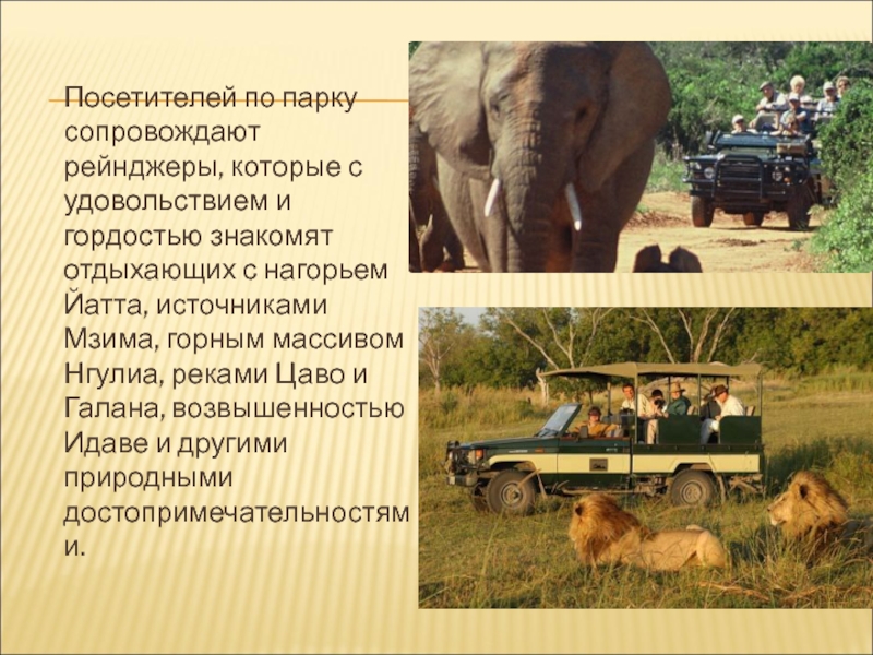 отдыхающих с нагорьем Йатта, источниками Мзима, горным массивом Нгулиа, реками Цаво и Галана, возвышенностью Идаве и другими природными достопримечательностями.