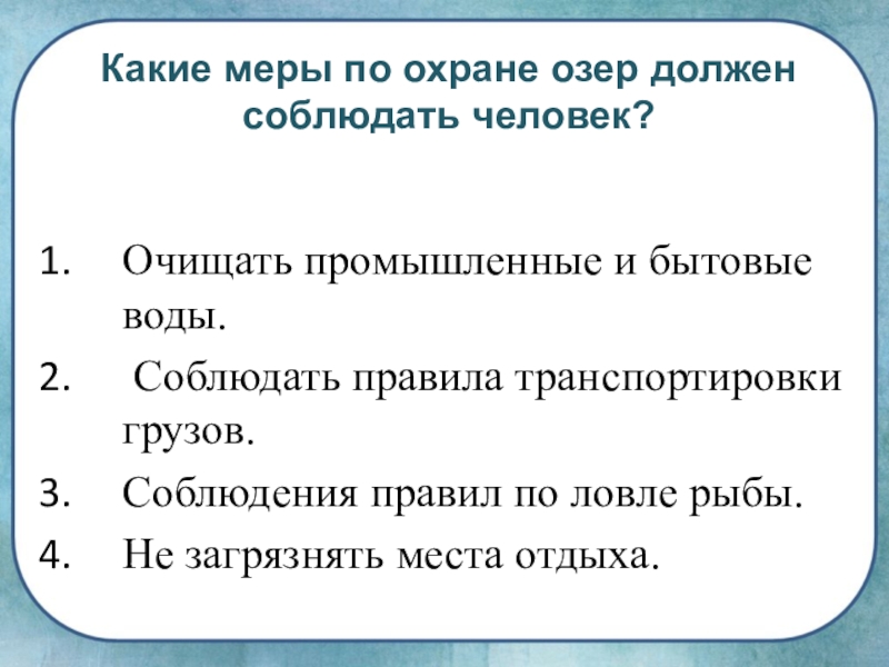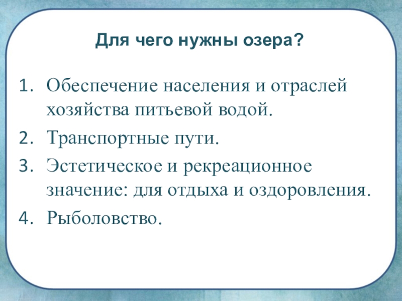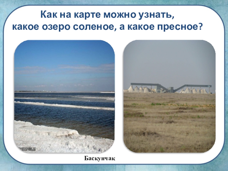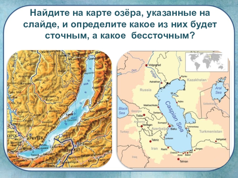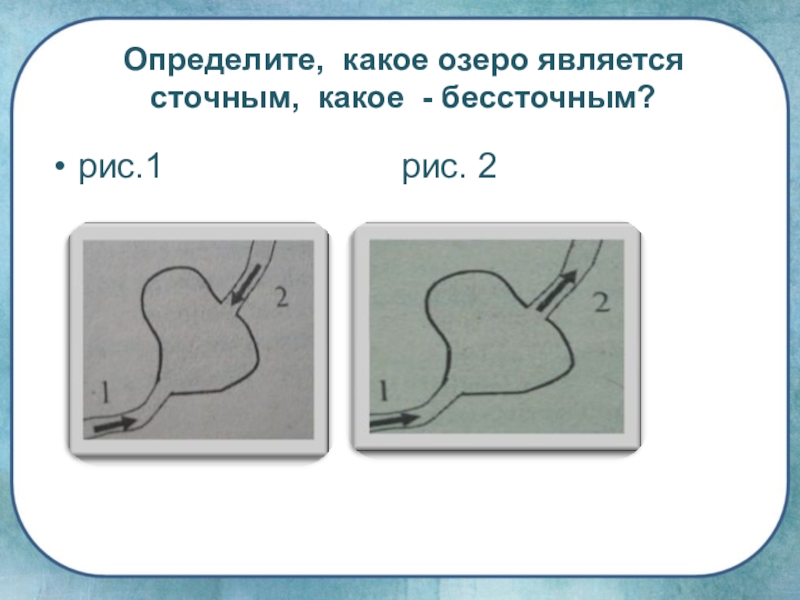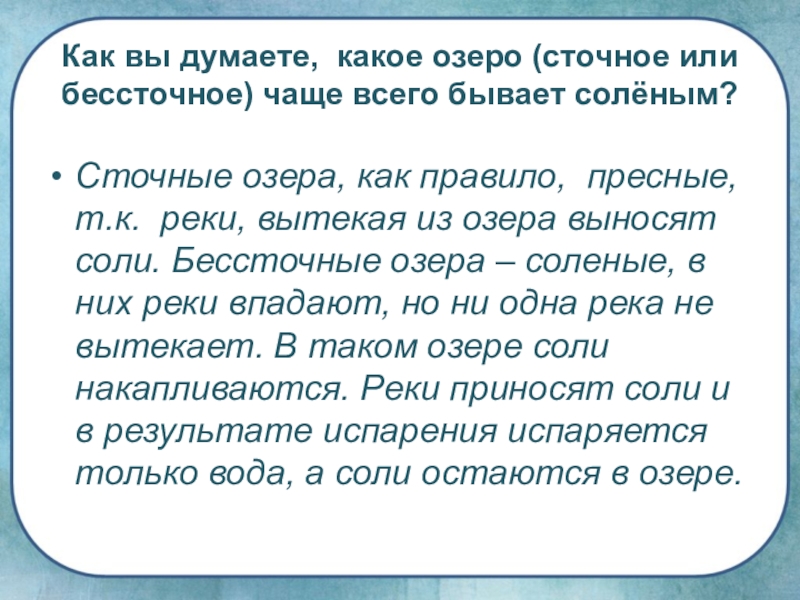 Сточные озера, как правило, пресные, т.к. реки, вытекая из озера выносят соли. Бессточные озера – соленые, в них реки впадают, но ни одна река не вытекает. В таком озере соли накапливаются. Реки приносят соли и в результате испарения испаряется только вода, а соли остаются в озере.