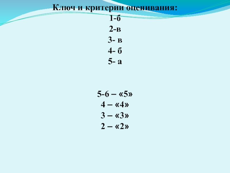 Ключ и критерии оценивания:1-б2-в3- в4- б5- а5-6 – «5» 4 – «4»3 – «3»2 – «2»
