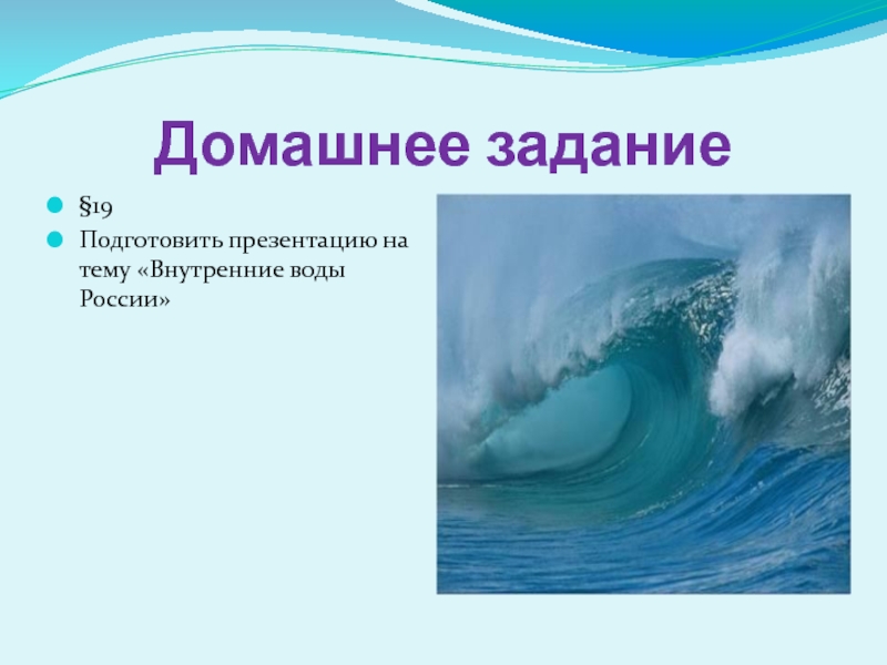 Домашнее задание§19Подготовить презентацию на тему «Внутренние воды России»
