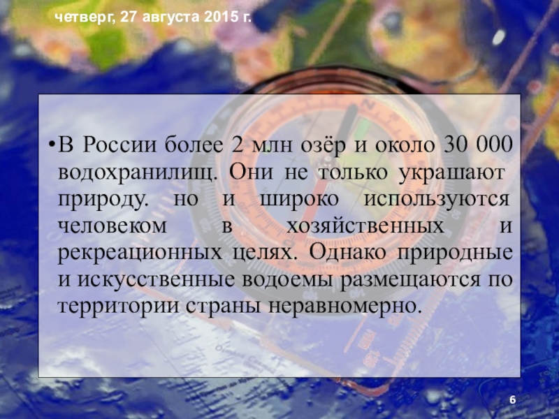 Они не только украшают природу. но и широко используются человеком в хозяйственных и рекреационных целях. Однако природные и искусственные водоемы размещаются по территории страны неравномерно.