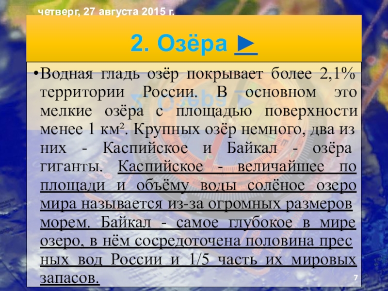 Слайд 72. Озёра ►