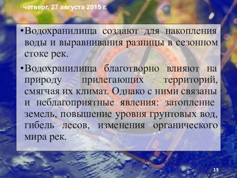 Слайд 13Водохранилища создают для накопления воды и выравнивания разницы в сезонном стоке