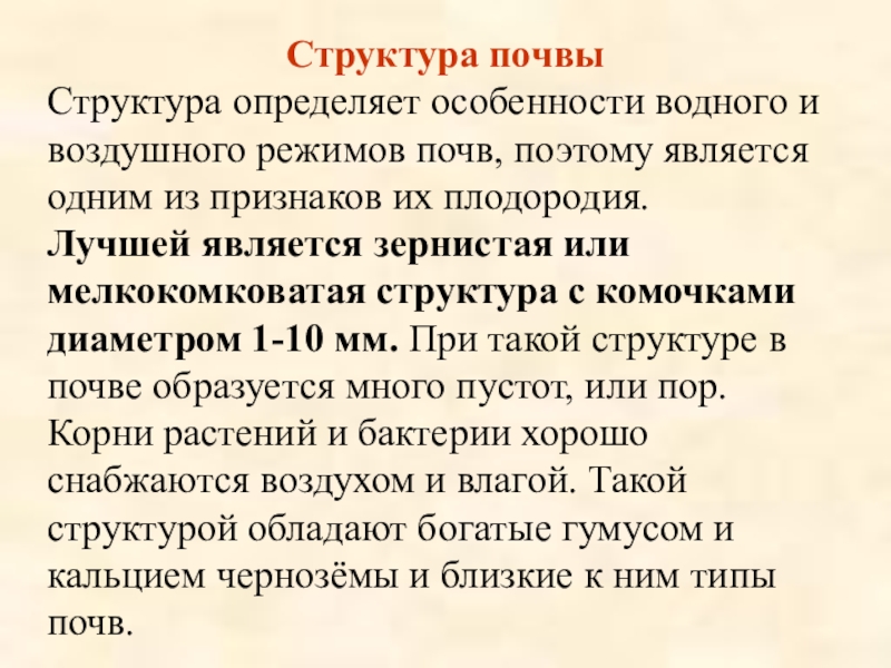 Структура определяет особенности водного и воздушного режимов почв, поэтому является
