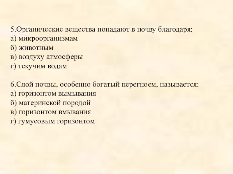 Слайд 435.Органические вещества попадают в почву благодаря: