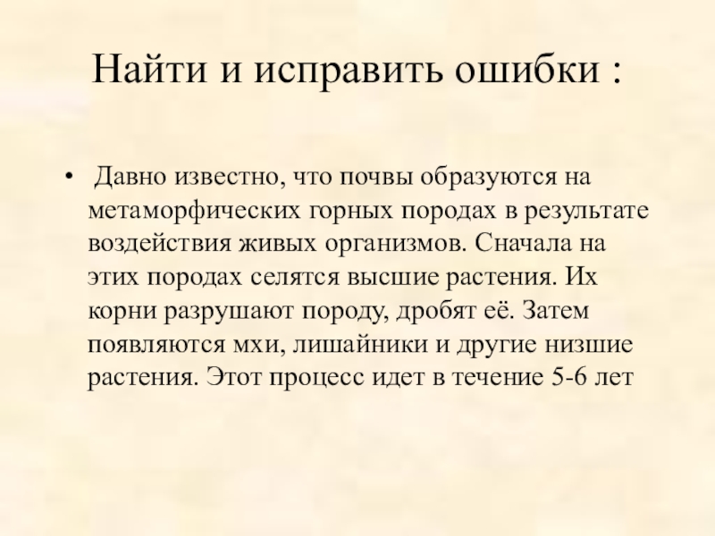 метаморфических горных породах в результате воздействия живых организмов. Сначала на этих породах селятся высшие растения. Их корни разрушают породу, дробят её. Затем появляются мхи, лишайники и другие низшие растения. Этот процесс идет в течение 5-6 лет