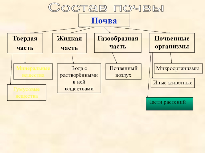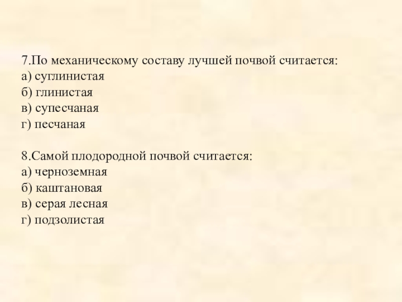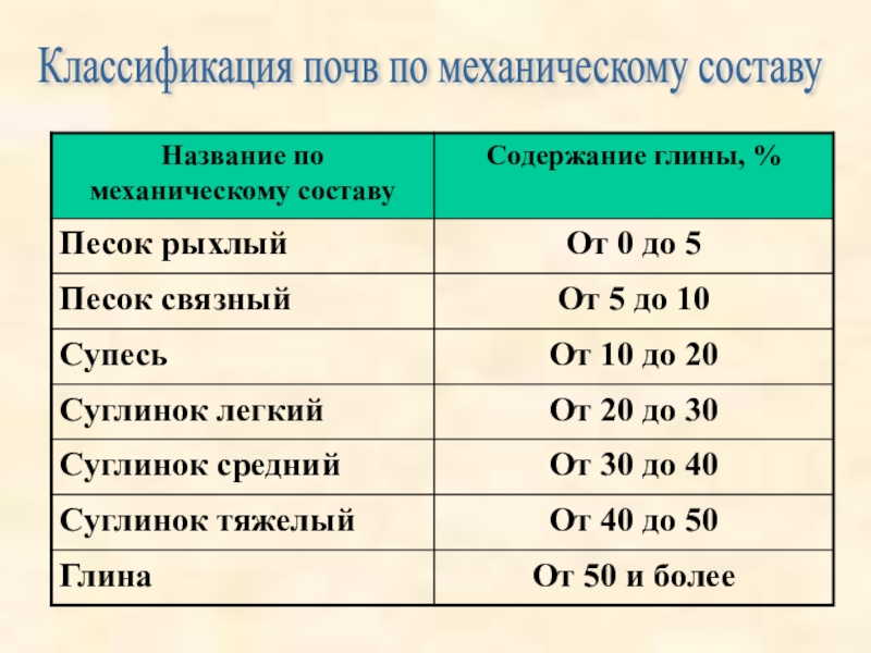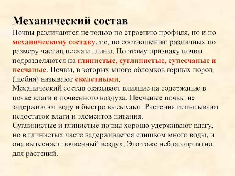 механическому составу, т.е. по соотношению различных по размеру частиц песка и глины. По этому признаку почвы подразделяются на глинистые, суглинистые, супесчаные и песчаные. Почвы, в которых много обломков горных пород (щебня) называют скелетными.