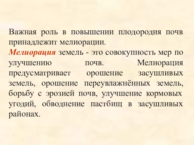 Слайд 37Важная роль в повышении плодородия почв принадлежит мелиорации.