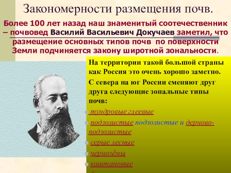 Более 100 лет назад В.В.Докучаев установил, что размещение основных типов почв подчинено закону широтной зональности на равнинах и высотной поясности в горах.