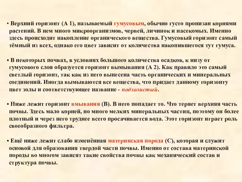 Ещё ниже лежит слабо изменённая материнская порода (С), которая и служит основой для образования твердой части почвы. Именно от состава материнской породы во многом зависят такие свойства почвы как механический состав и структура почвы.