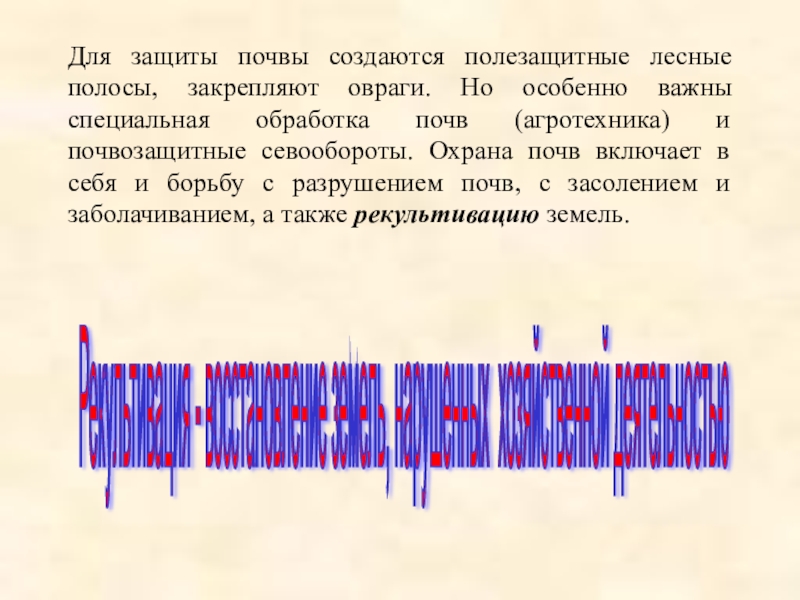 Слайд 36Для защиты почвы создаются полезащитные лесные полосы, закрепляют овраги. Но особенно