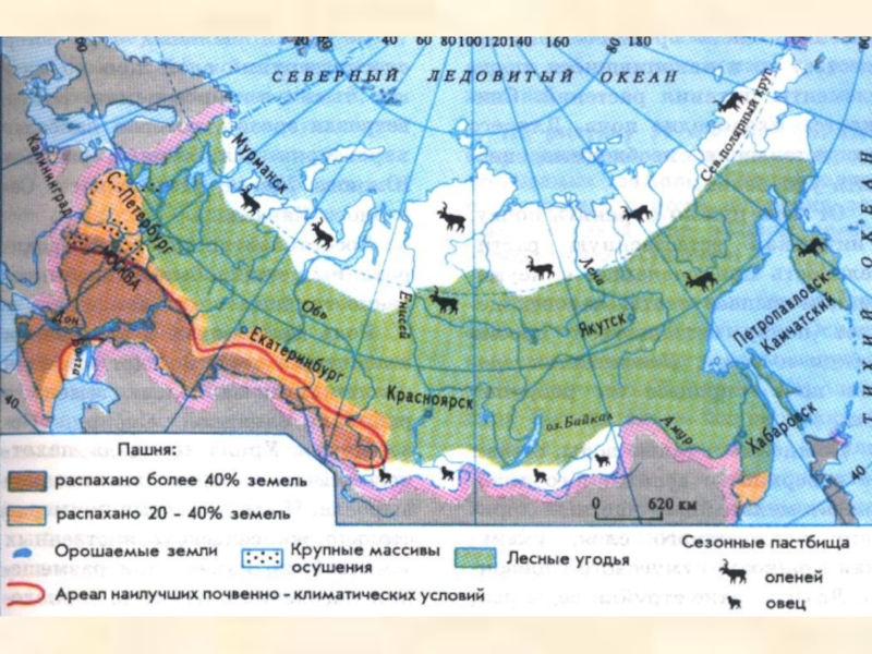 Слайд 34Большая часть сельскохозяйственных земель России расположена в южной половине страны. Под