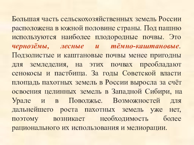 пашню используются наиболее плодородные почвы. Это чернозёмы, лесные и тёмно-каштановые. Подзолистые и каштановые почвы менее пригодны для земледелия, на этих почвах преобладают сенокосы и пастбища. За годы Советской власти площадь пахотных земель в России выросла за счёт освоения целинных земель в Западной Сибири, на Урале и в Поволжье. Возможностей для дальнейшего роста пахотных земель уже нет, поэтому возникает необходимость более рационального их использования и мелиорации.