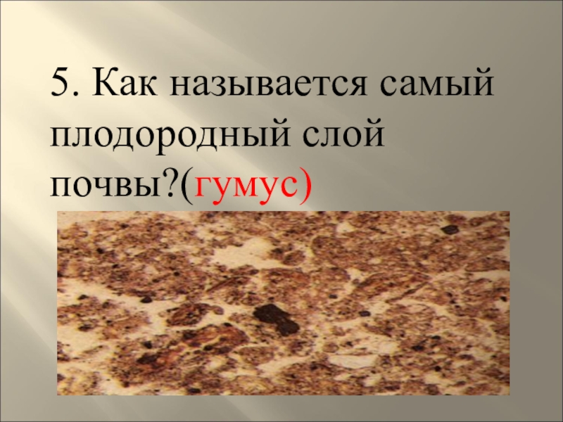 Слайд 165. Как называется самый плодородный слой почвы?(гумус)