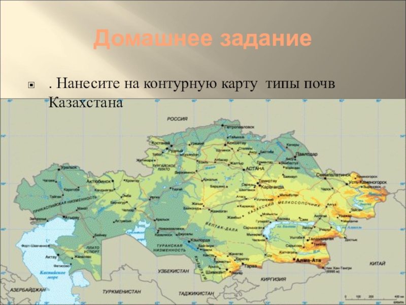 Домашнее задание . Нанесите на контурную карту типы почв Казахстана