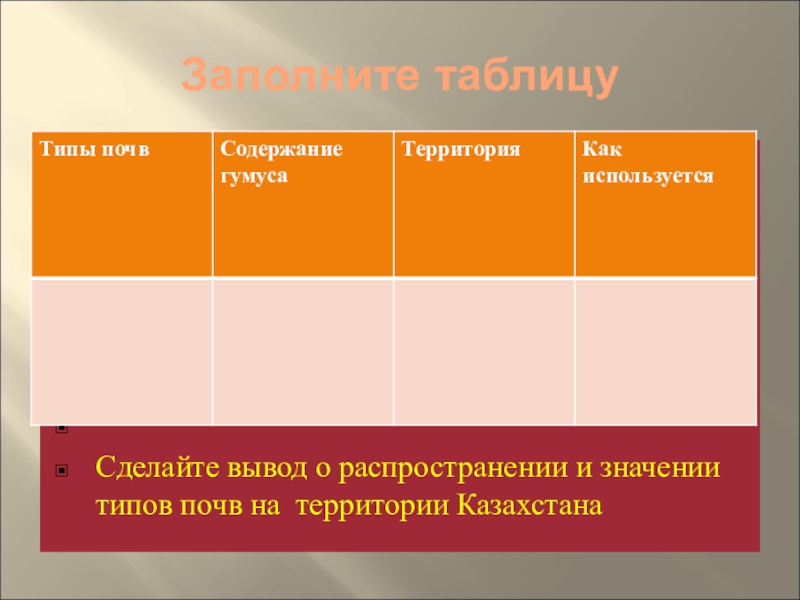 Заполните таблицу   Сделайте вывод о распространении и значении типов почв на территории Казахстана    Сделайте вывод о распространении