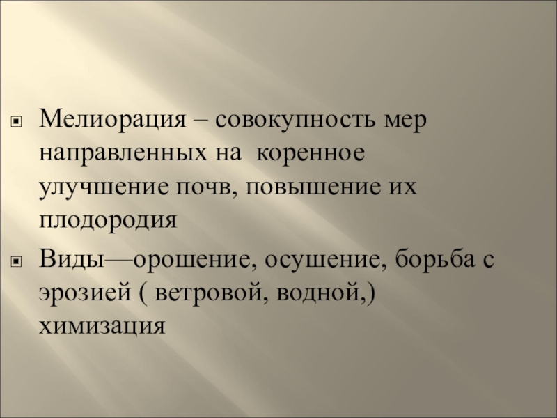 Слайд 27Мелиорация – совокупность мер направленных на коренное улучшение почв, повышение их