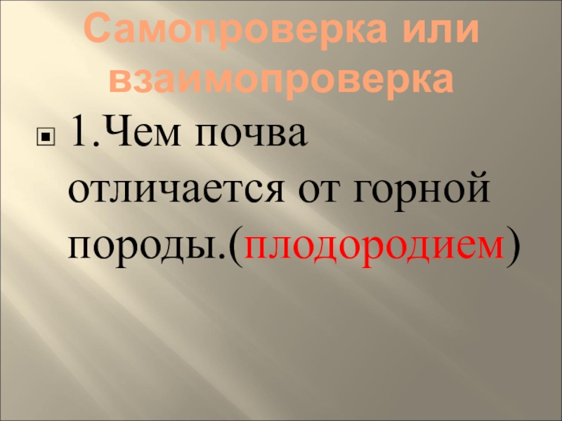 Самопроверка или взаимопроверка 1.Чем почва отличается от горной породы.(плодородием)