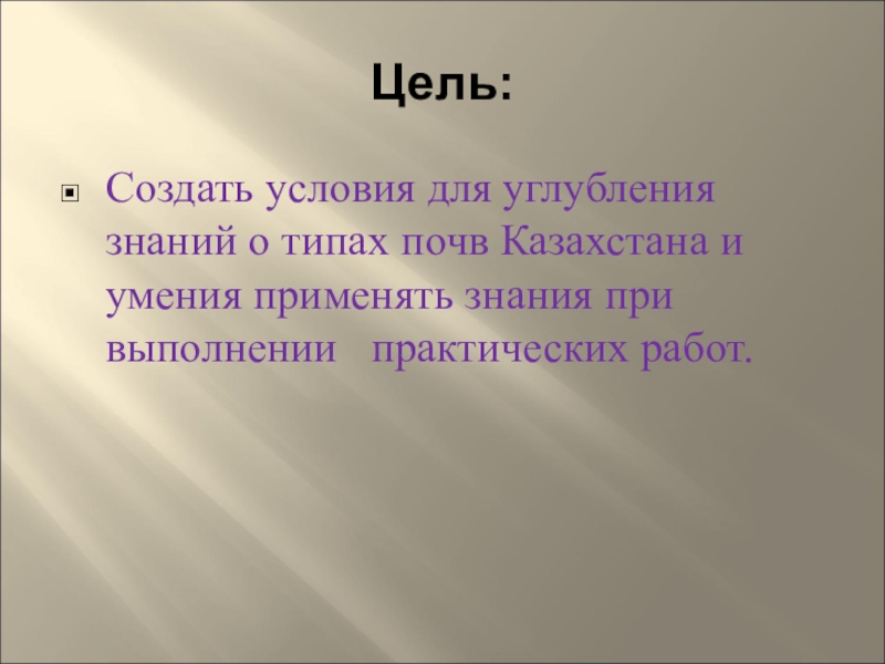Цель:Создать условия для углубления  знаний о типах почв Казахстана и умения применять знания при выполнении