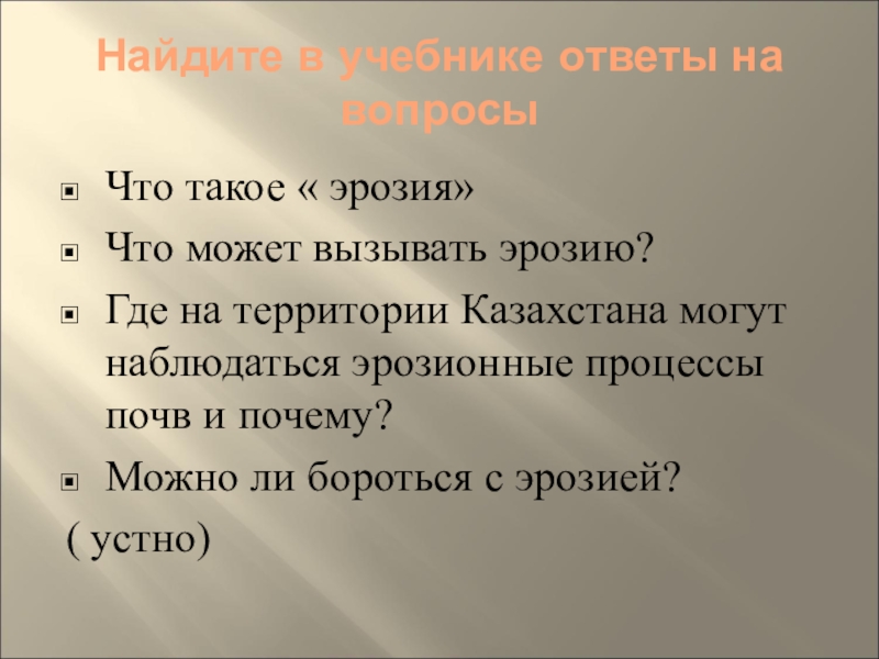 Найдите в учебнике ответы на вопросы Что такое « эрозия»Что может вызывать эрозию?Где на территории Казахстана могут