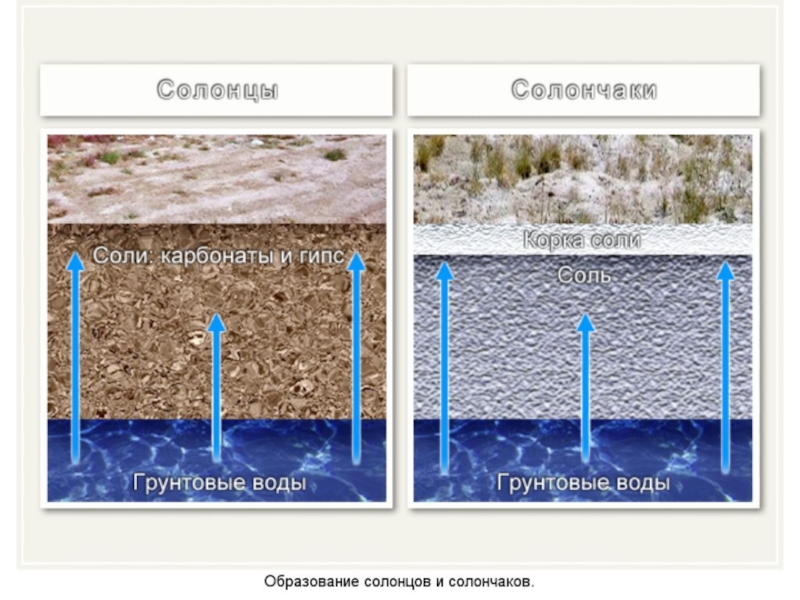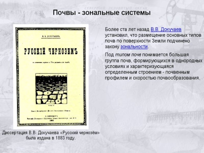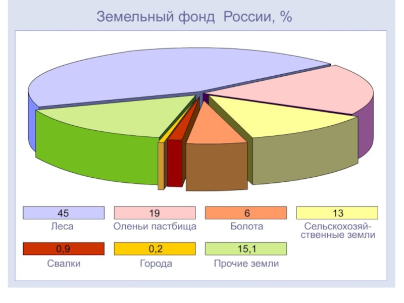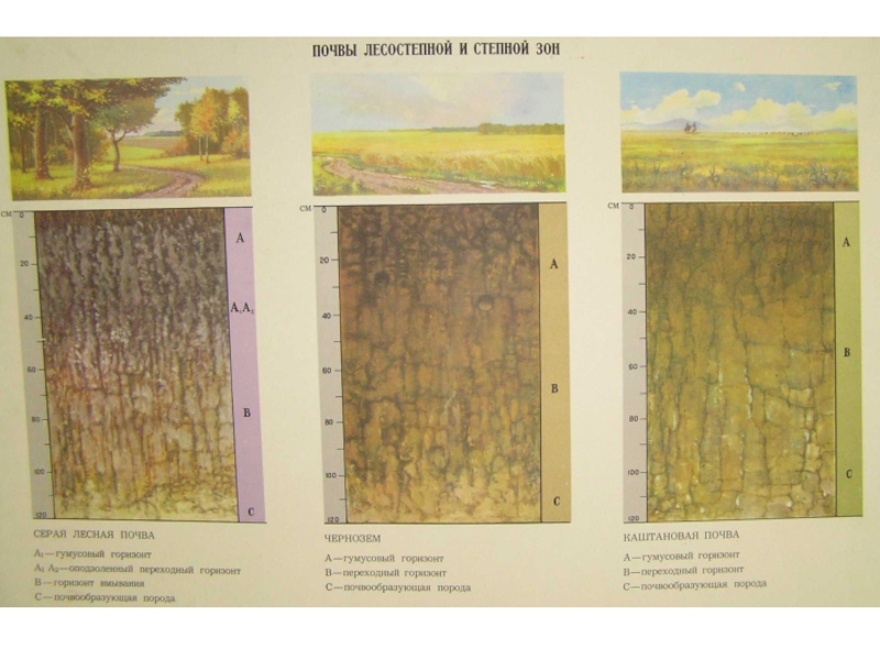 Основные типы почв России: тундрово-глеевые, подзолистые и дерново-подзолистые, серые и бурые лесные, чернозёмы и каштановые почвы.