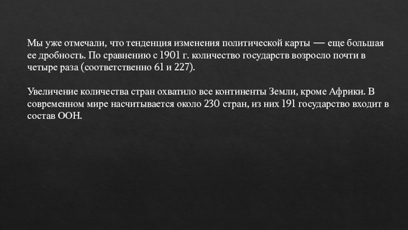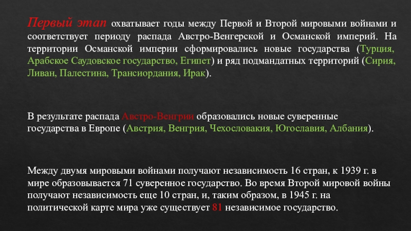 Между двумя мировыми войнами получают независимость 16 стран, к 1939 г. в мире образовывается 71 суверенное государство. Во время Второй мировой войны получают независимость еще 10 стран, и, таким образом, в 1945 г. на политической карте мира уже существует 81 независимое государство.