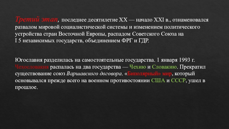 Югославия разделилась на самостоятельные государства. 1 января 1993 г. Чехословакия распалась на два государства — Чехию и Словакию. Прекратил существование союз Варшавского договора. «Биполярный» мир, который основывался прежде всего на военном противостоянии США и СССР, ушел в прошлое.