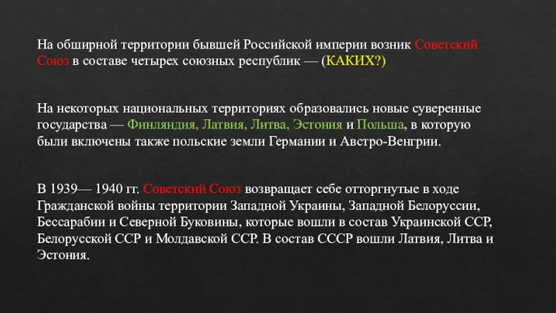 В 1939— 1940 гг. Советский Союз возвращает себе отторгнутые в ходе Гражданской войны территории Западной Украины, Западной Белоруссии, Бессарабии и Северной Буковины, которые вошли в состав Украинской ССР, Белорусской ССР и Молдавской ССР. В состав СССР вошли Латвия, Литва и Эстония.