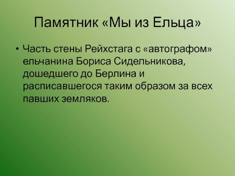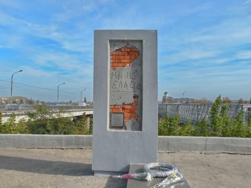 Памятник «Мы из Ельца»Часть стены Рейхстага с «автографом» ельчанина Бориса Сидельникова, дошедшего до Берлина и расписавшегося таким