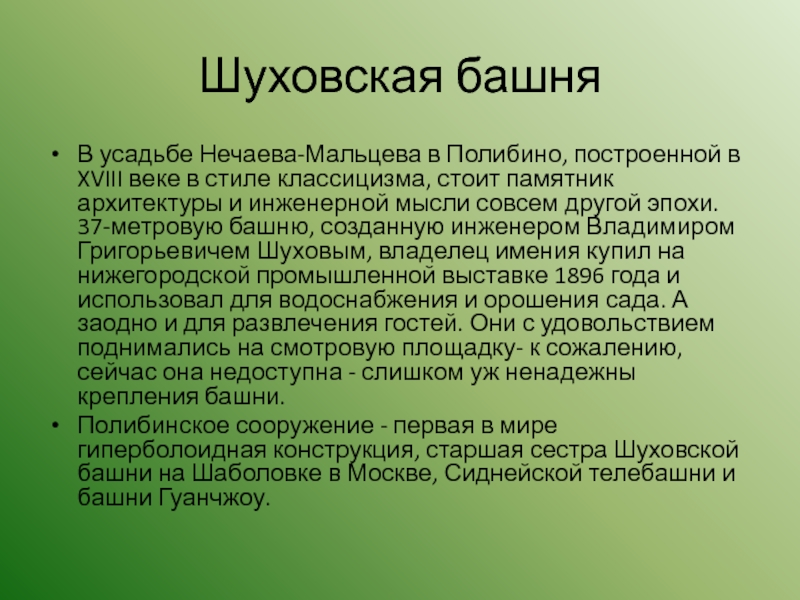 Шуховская башняВ усадьбе Нечаева-Мальцева в Полибино, построенной в XVIII веке в стиле классицизма, стоит памятник архитектуры и