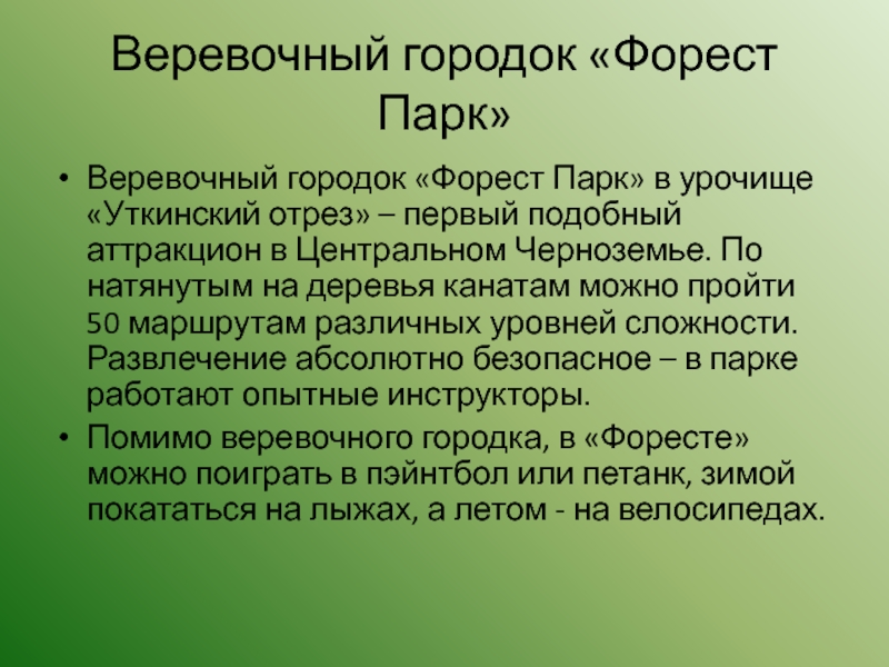 Веревочный городок «Форест Парк»Веревочный городок «Форест Парк» в урочище «Уткинский отрез» – первый подобный аттракцион в Центральном