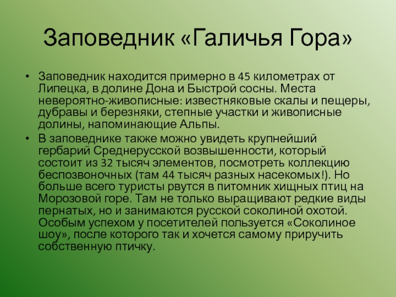 Заповедник «Галичья Гора»Заповедник находится примерно в 45 километрах от Липецка, в долине Дона и Быстрой сосны. Места