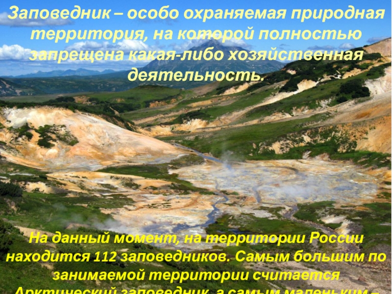 Заповедник – особо охраняемая природная территория, на которой полностью запрещена какая-либо хозяйственная деятельность. На данный момент, на территории России находится 112 заповедников. Самым большим по занимаемой территории считается Арктический заповедник, а самым маленьким – Галичья гора.