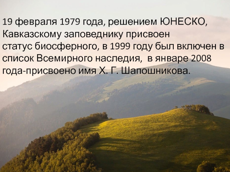 19 февраля 1979 года, решением ЮНЕСКО, Кавказскому заповеднику присвоен статус биосферного, в 1999 году