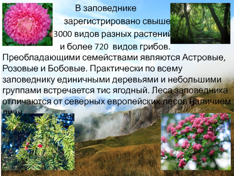 и более 720 видов грибов. Преобладающими семействами являются Астровые, Розовые и Бобовые. Практически по всему заповеднику единичными деревьями и небольшими группами встречается тис ягодный. Леса заповедника отличаются от северных европейских лесов наличием лиан.