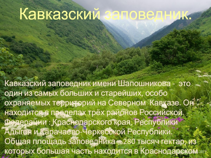 Кавказский заповедник.Кавказский заповедник имени Шапошникова - это один из самых больших и старейших, особо охраняемых территорий на