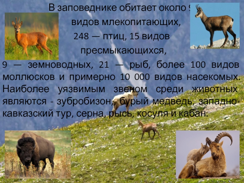 9 — земноводных, 21 — рыб, более 100 видов моллюсков и примерно 10 000 видов насекомых. Наиболее уязвимым звеном среди животных являются - зубробизон,, бурый медведь, западно-кавказский тур, серна, рысь, косуля и кабан.
