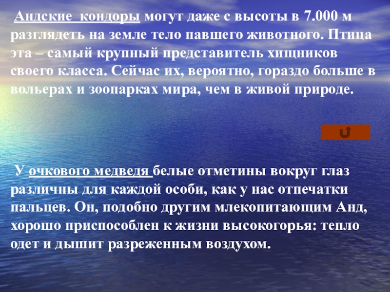 У очкового медведя белые отметины вокруг глаз различны для каждой особи, как у нас отпечатки пальцев. Он, подобно другим млекопитающим Анд, хорошо приспособлен к жизни высокогорья: тепло одет и дышит разреженным воздухом.